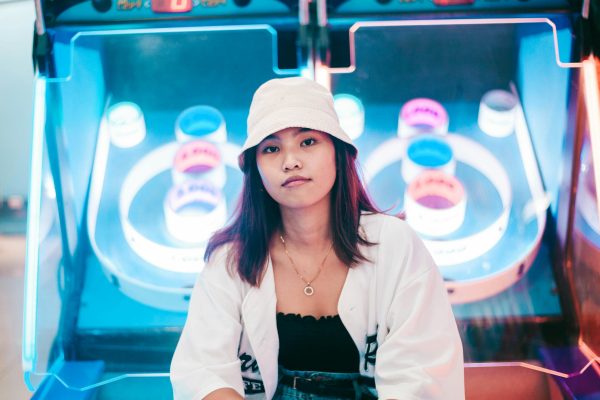 A Young Woman In Casual Fashion Sitting Near Arcade Games, Surrounded By Vibrant Neon Lights.