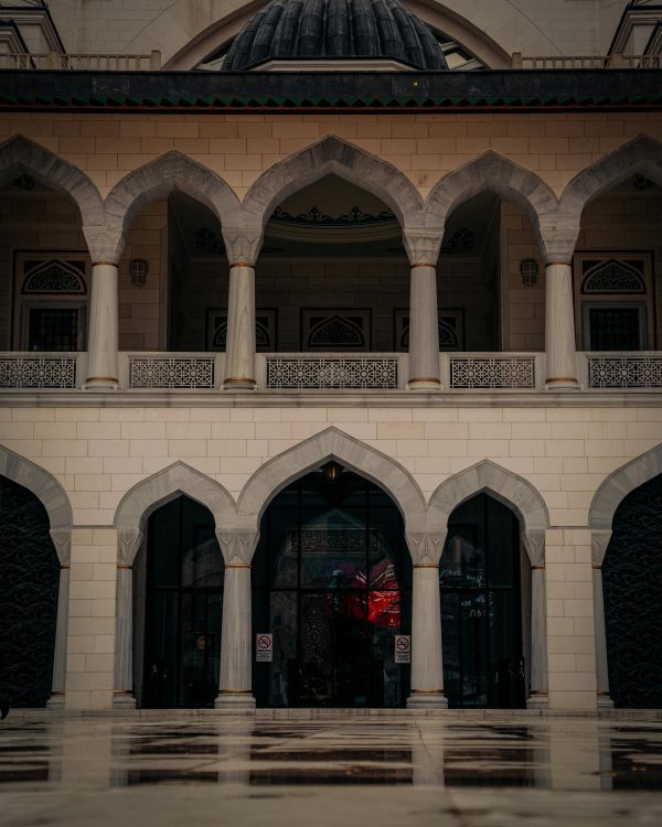 Majestic Mosque Facade Featuring Intricate Arches And A Dome, Captured In Low Light For A Dramatic Effect.