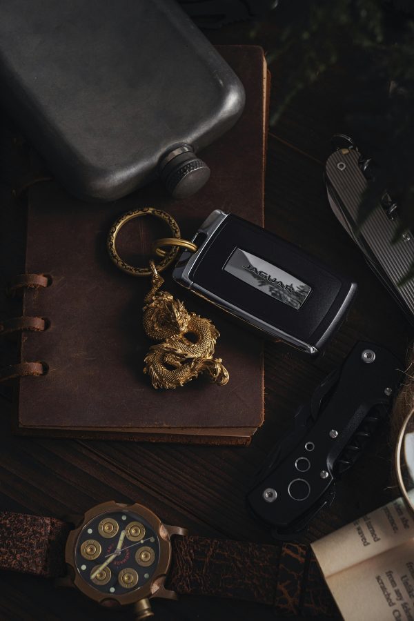 Elegant Rustic Arrangement Of Car Key, Dragon Pendant, And Vintage Accessories.
