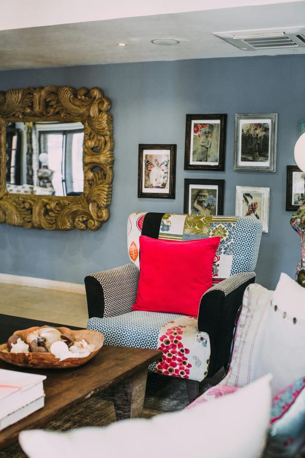 Charming Living Room Interior Featuring A Colorful Patchwork Armchair And Wall Art.