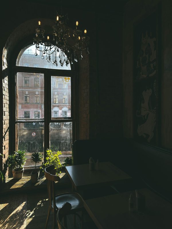 A Vintage Café Interior Showcasing An Arched Window, Plants, And Chandelier.