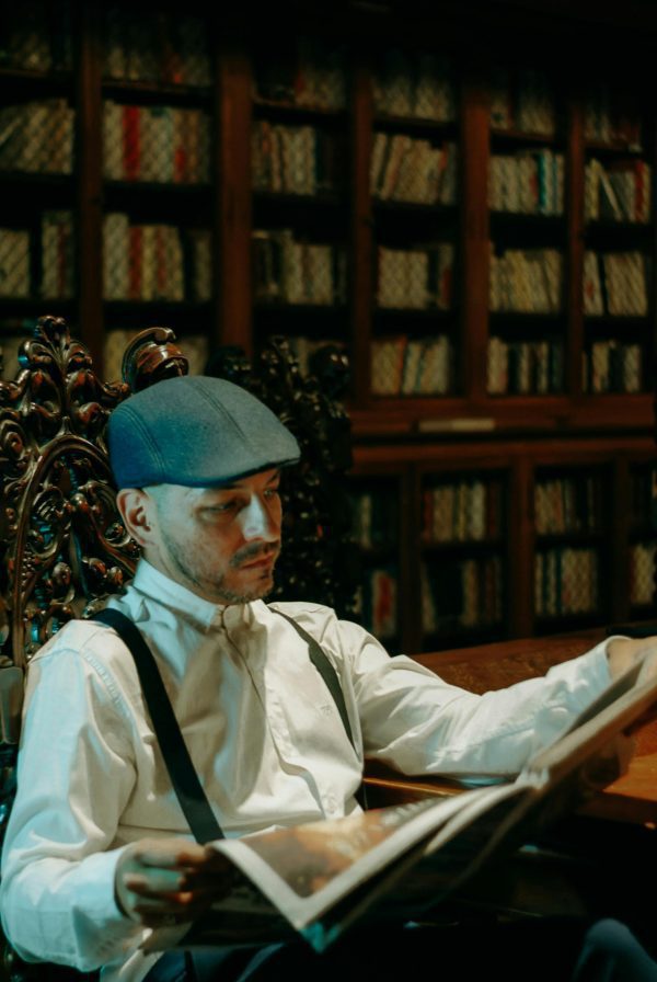 Adult Man In A Vintage Library Reading A Newspaper, Wearing Suspenders And A Flat Cap.