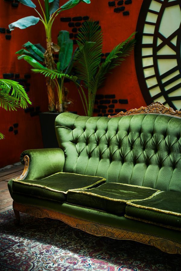 Elegant Vintage Green Sofa In A Stylish Room With Tropical Plants And Large Wall Clock.