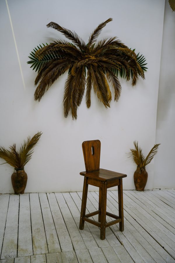 A Minimalist Indoor Space Featuring A Wooden Chair And Dried Palm Decor For A Rustic Vibe.