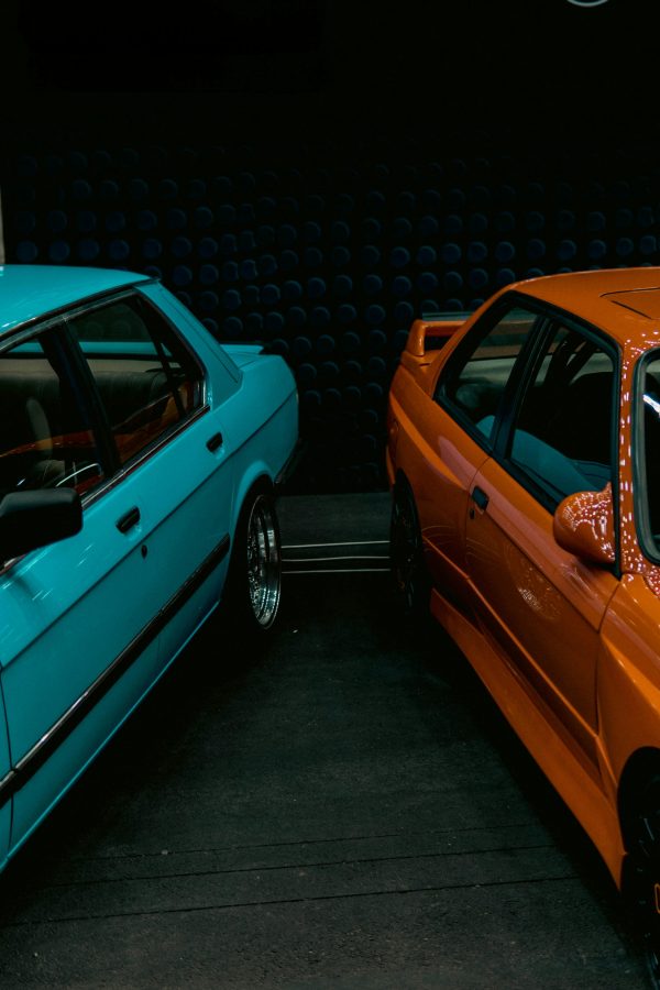 Close Up Of Vintage BMW E28 And E30 Models Displayed At An Indoor Car Exhibition.
