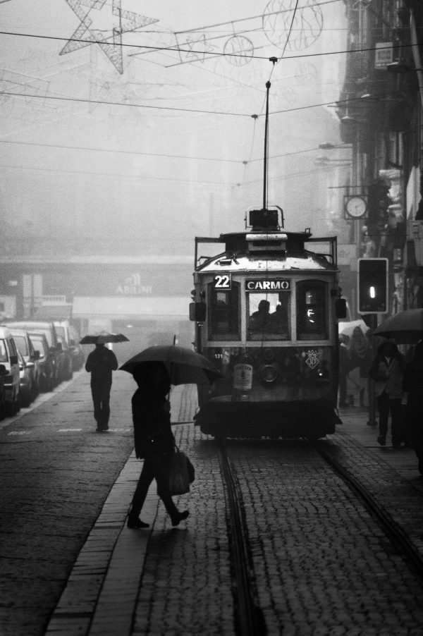 A Black And White Photo Of A Tram In Porto, Capturing Rainy Street Life And Public Transportation.