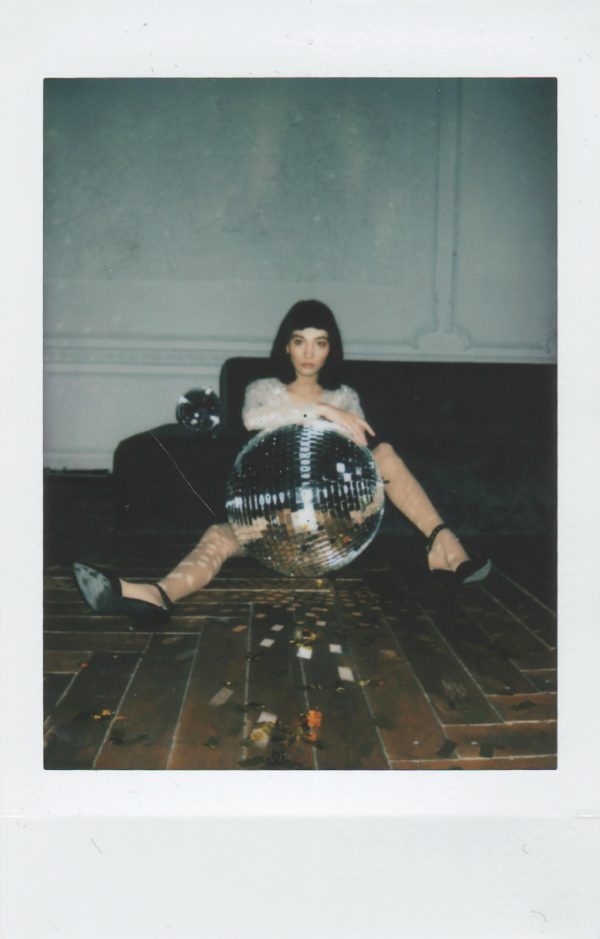 Fashionable Woman Posing With A Disco Ball Indoors. Vintage Polaroid Style.