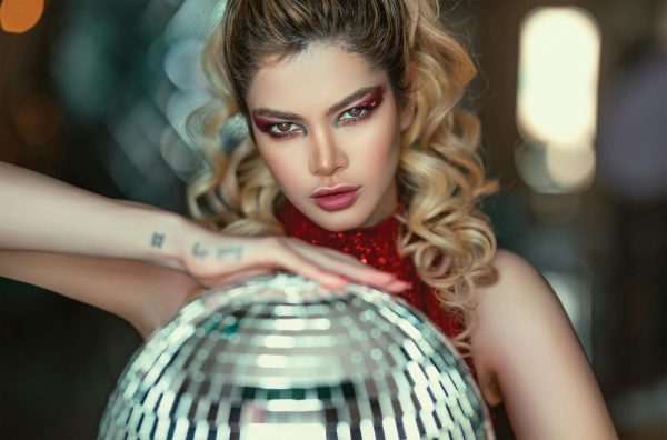 Stylish Woman With Expressive Eyes Poses With A Disco Ball, Glamorous Makeup Enhancing Her Features.