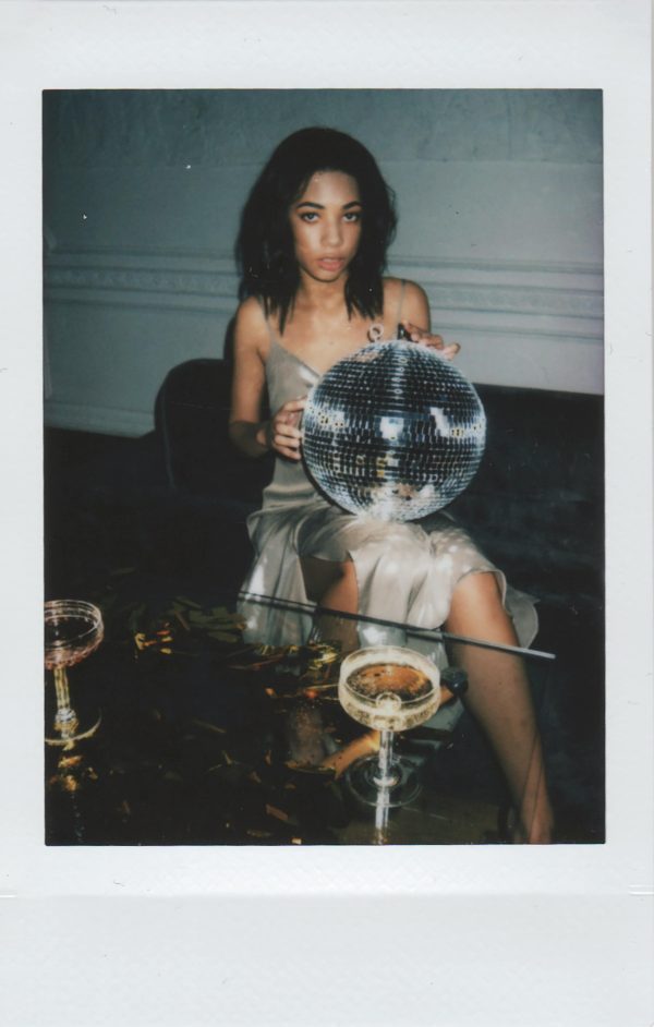 A Glamorous Woman In A Stylish Dress Posing With A Disco Ball Indoors, Capturing A Chic And Fashionable Vibe.