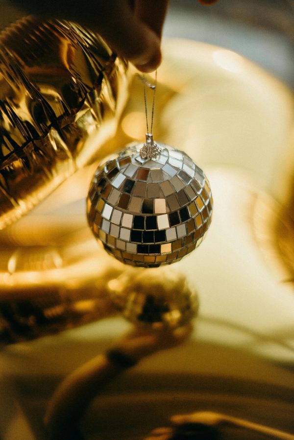 Shimmering Disco Ball Held Against A Warm Gold Reflective Background, Creating A Festive Atmosphere.