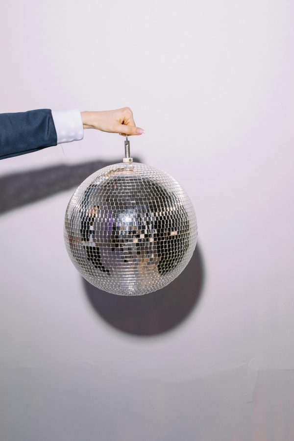 A Hand Holding A Reflective Disco Ball Against A Plain White Background, Casting A Shadow.